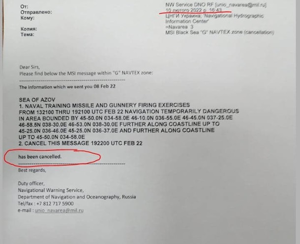 "В 16:43 сегодня 10.02.2022 управление навигации и океанографии минобороны РФ сообщило об отмене перекрытия района Азовского моря к северу от Керченского пролива", - написал он в Facebook.